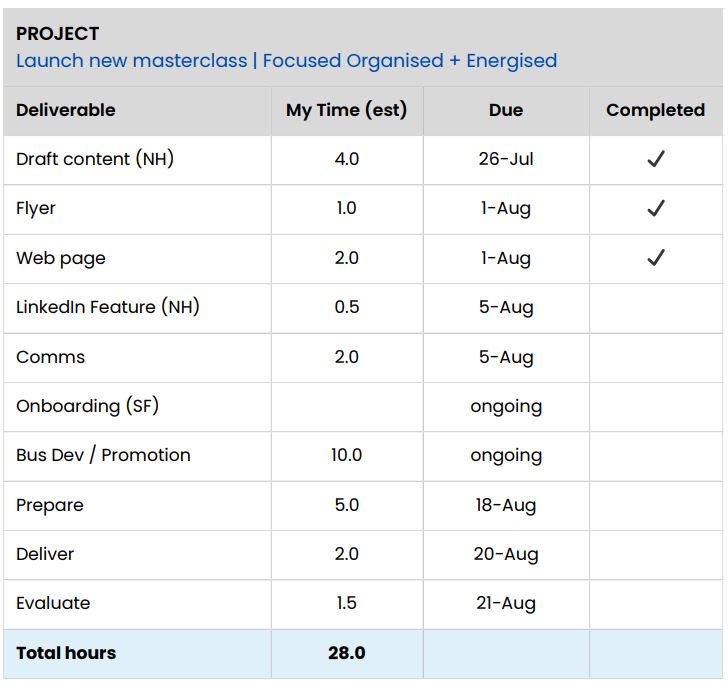 That bottom line, the total estimated hours, is what creates realism. It helps you hold boundaries, communicate capacity, and protect your time.